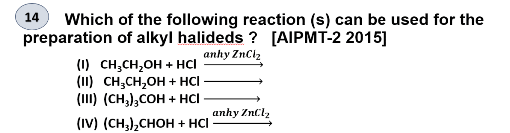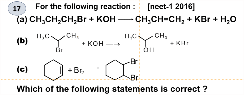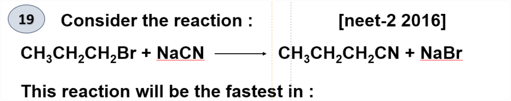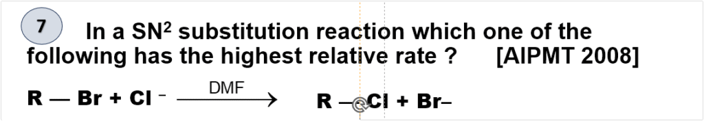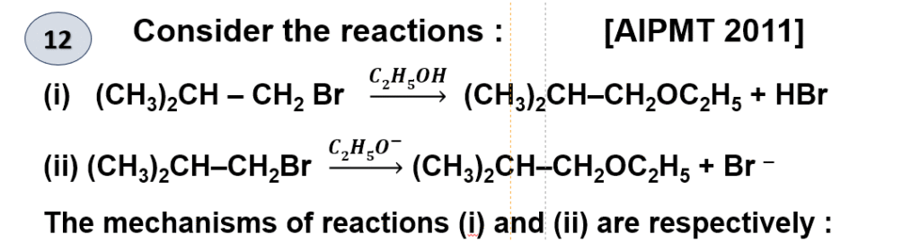 Chemistry_Class-12_DPP-1_Ch-6_Haloalkanes and Haloarenes. 1 / 25 1. Which of the following is an optically active compound? A) 1 – Butanol B) 1 – propanol C) 2 – chlorbutane D) 4 – Hydroxy heptane 2 / 25 2 – Bromopentane is heated with potassium ethoxide in ethanol. The major product obtained is? A) 2 – ethoxypentane B) pentene C) trans pent - 2- ene D) cis – pent- 2- ene 3 / 25 3. CH3 CH2 CH (Cl) CH3 obtained by chlorination on n- butane, will be A) 𝒍−𝒇𝒐𝒓𝒎 B) 𝒅−𝒇𝒐𝒓𝒎 C) 𝒎𝒆𝒔𝒐 𝒇𝒐𝒓𝒎 D) Racemic mixture 4 / 25 4. An organic compound A (C4H9Cl) on reaction with Na /dry ether gives a hydrocarbon which on monochlorination gives only one chloro derivative ,then A is A) tert – butyl chloride B) sec- butyl chloride C) isobuthyl chloride D) n-butyl chloride 5 / 25 A) B) C) D) 6 / 25 6. Reactivity order of halides for dehydrohalogenation is A) R – F > R – Cl > R – Br > R – I B) R – I > R – Br > R – Cl > R – F C) R – I > R – Cl > R – Br > R – F D) R – F > R – I > R – Br > R – Cl 7 / 25 7. In a SN2 substitution reaction which one of the following has the highest relative rate ? \textbf{Question:} In an \textit{SN}$_2$ substitution reaction, which one of the following has the highest relative rate? Given the reaction: \[ \text{R - Br} + \text{Cl}^- \xrightarrow{\text{DMF}} \text{R - Cl} + \text{Br}^- \] \textbf{Options:} \begin{enumerate} \item Primary halide with Br$^-$ as leaving group \item Secondary halide with Br$^-$ as leaving group \item Tertiary halide with Br$^-$ as leaving group \item Primary halide with Cl$^-$ as leaving group \end{enumerate} \textit{[AIPMT 2008]} A) B) C) D) 8 / 25 8. Which of the following is least reactive in a nucleophilic substitution reaction ? A) B) C) D) 9 / 25 9. Which of the following undergoes nucleophilic substitution exclusively by SN1 mechanism? A) Ethyl chloride B) Isopropyl chloride C) Chlorbenzene D) chlorophenylmethane 10 / 25 10. Which of the following reactions is an example of nucleophilic substitution reaction ? A) RX + KOH ----> ROH + KX B) 2RX + 2Na ----> R – R + 2NaX C) RX + H2 ----> RH + HX D) RX + Mg ----> RMgX 11 / 25 11. Which of the following reactions is an example of nucleophilic substitution reaction? A) B) C) D) 12 / 25 Consider the reactions: (CH₃)₂CH - CH₂Br c. H₂O ⟶ (CH₃)₂CH - CH₂OCH₃ + HBr (CH₃)₂CH - CH₂Br c. H₂O ⟶ (CH₃)₂CH - CH₂OCH₂ + Br⁻ The mechanisms of reactions (i) and (ii) are respectively : A) B) C) D) 13 / 25 13. In which of the following compounds, the C–Cl bond ionisation shall give most stable carbonium ion ? A) B) C) D) 14 / 25 14. A) (I), (III) and (IV) only B) (I) and (II) only C) (IV) only D) (III) and (IV) only 15 / 25 15. Which of the following statements is not correct for a nucleophile ? A) Nucleophile is a Lewis acid B) Ammonia is a nucleophile C) Nucleophiles attack low e– density sites D) Nucleophiles are not electron seeking 16 / 25 16. In an SN1 reaction on chiral centers there is : A) 100 % racemization B) inversion more than retention leading to partial racemization C) 100 % retention D)100 % inversion 17 / 25 17. A) (a) is substitution, (b) and (c) are addition reactions. B) (a) and (b) are elimination reactions and (c) is addition reaction. C) (a) is elimination, (b) is substitution and (c) is addition reaction. D) (a) is elimination, (b) and (c) are substitution reaction. 18 / 25 18. A) X = 1-Butyne ; y = 2-Hexyne B) X = 1-Butyne ; y = 3-Hexyne C) X = 2-Butyne ; y = 3-Hexyne D) X = 2-Butyne ; 2 = 2-Hexyne 19 / 25 19. A) ) water B) ethanol C) methanol D) N,N’-dimethylformaide (DMF) 20 / 25 20. Which of the following can be used as the halide component for Freidel–Crafts reaction? A) Isopropyl chloride B) Chlorobenzene C) Bromobenzene D) Chloroethene 21 / 25 21. Which of the following compounds shall not produce propene by reaction with HBr followed by elimination or direct only elimination reaction ? A) B) C) D) 22 / 25 22. Which one of the following nitro-compounds does not react with nitrous acid A) B) C) D) 23 / 25 23. The correct statement regarding electrophile is : A) Electrophile is a negatively charged species and can form a bond by accepting a pair of electrons from a nucleophile B) Electrophile is a negatively charged species and can form a bond by accepting a pair of electrons from another electrophile C) Electrophiles are generally neutral species and can form a bond by accepting a pair of electrons from a nucleophile D) Electrophile can be either neutral or positively charged species and can form a bond by accepting a pair of electrons from a nucleophile 24 / 25 24. The compound A on treatment with Na gives B, and with PCl5 gives C, B and C react together to give diethyl ether. A, B and C are in the order A) B) C) D) 25 / 25 25. Among the following the reaction that produce through an electrophilic substitution is \ce{NH3 + H2O -> NH4+ + OH-} A) B) C) D) Your score isThe average score is 10% 0% Exit